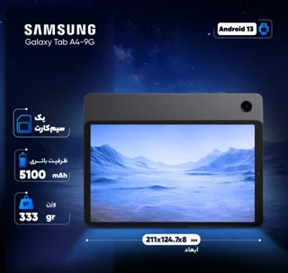تبلت ۸.۷ اینچ سامسونگ مدل Galaxy Tab A9-4G با ظرفیت 64 گیگابایت و رم 4 گیگابایت، طراحی باریک و سبک، صفحه نمایش با کیفیت، عملکرد روان و اتصال 4G، مناسب برای کارهای روزمره، تفریح و استفادههای آموزشی با عمر باتری طولانی و قابلیتهای متنوع.
